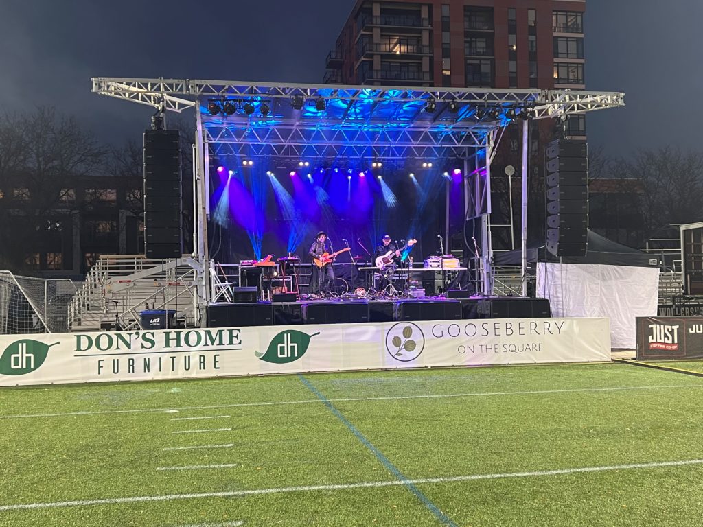 Patiño’s Music, à Chicago, est un guichet unique : non seulement il propose des systèmes de sonorisation et des haut-parleurs, des installations d’éclairage, des murs vidéo et des générateurs pour l’ensemble du spectacle, mais il possède également deux scènes mobiles SL100 qu’il peut livrer entièrement équipées.